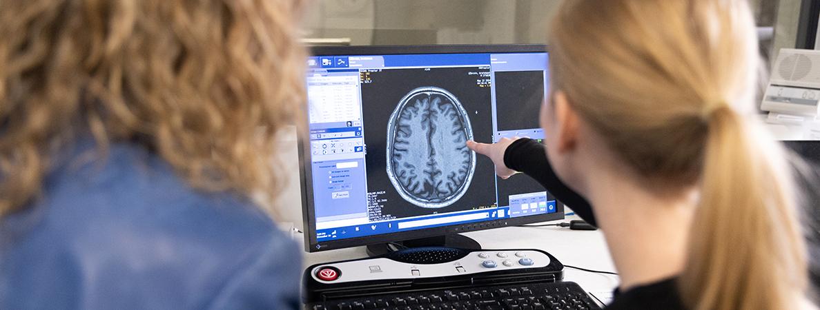 A student and faculty member looking at a MRI brain scan