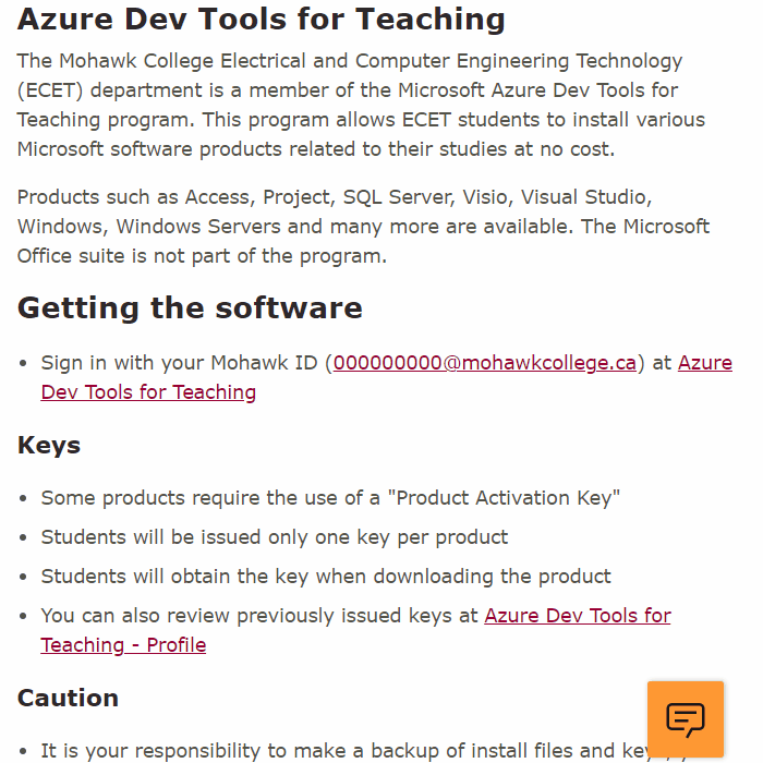 The Mohawk College Computer Science and Information Technology (CSAIT) department is a member of the Microsoft Azure Dev Tools for Teaching program. This program allows CSAIT students to install various Microsoft software products related to their studies at no cost.