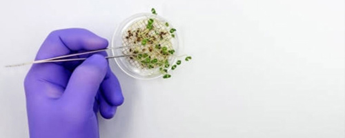 Gloved hand with tweezers picking seedlings