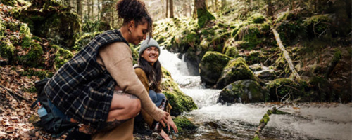 Two people crouched down by a creek in a forest